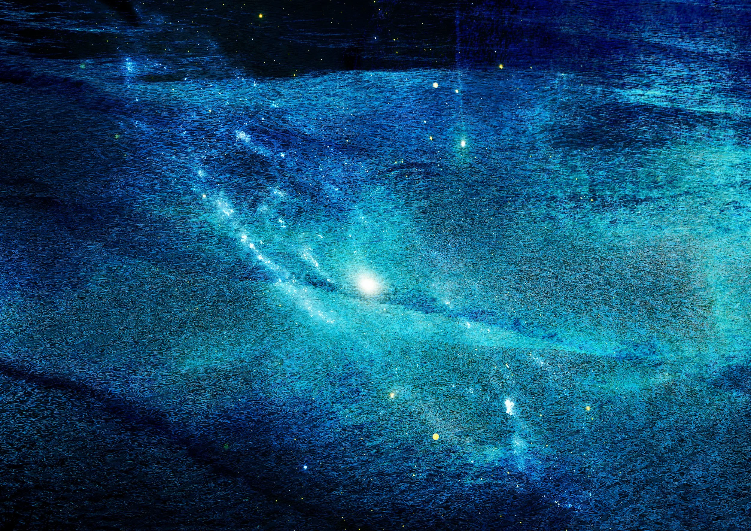 This work expresses the energy of expansion and freedom, symbolizing the Andromeda Galaxy. Light diffuses like pale bluish-white clouds, flowing inward and suggesting an impulse to move beyond constraint into the unknown. Layers of light and stellar rhythms evoke a longing for unseen worlds and a desire to transcend boundaries.