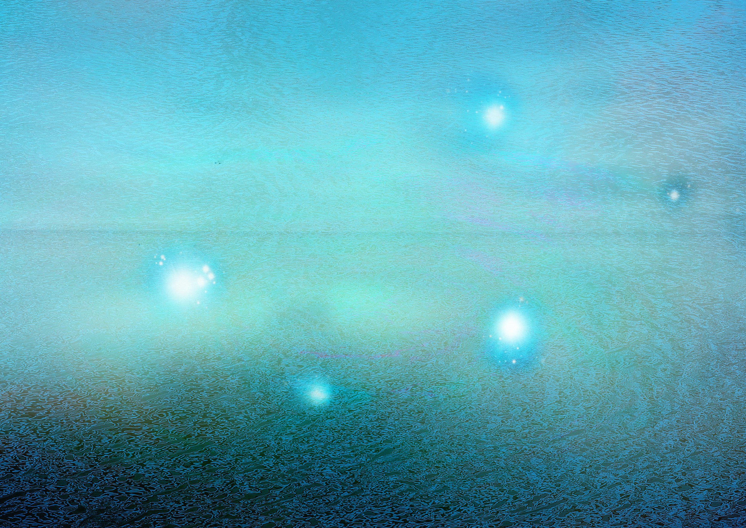 At the center, a cluster of stars is suggested within a pale blue-white field of light, spreading outward like gentle ripples on water. Aqua tones dominate the surface, with subtle variations suggesting overlapping stars in slow motion. The image recalls the color of an imagined childhood sky reflected on water, blending memory with starlight so the Pleiades feel distant, calm, and quietly familiar.