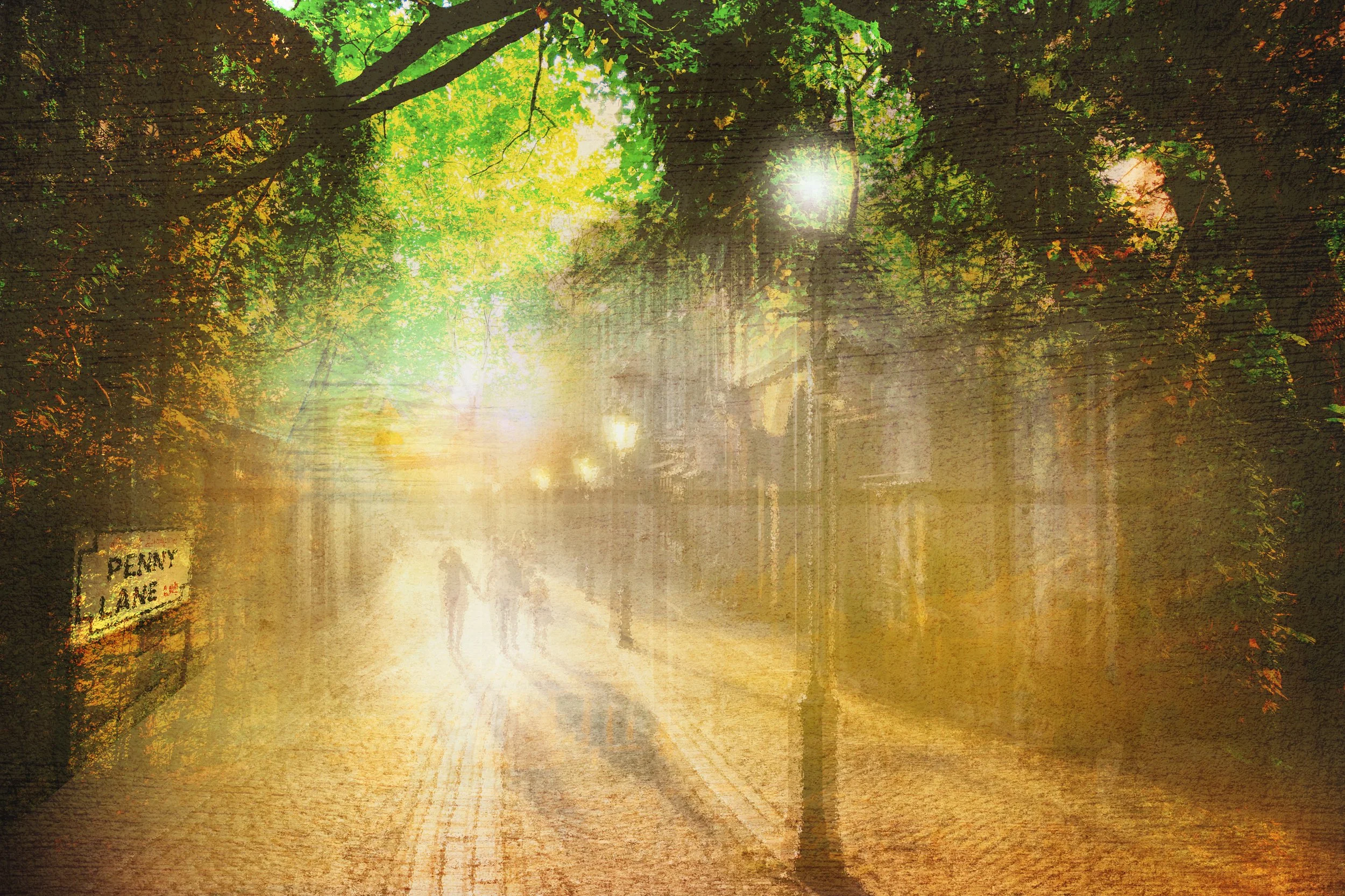 Memories do not preserve perfect forms. Over time, shapes deform, details fade, and only light remains as the last witness to time. Like an object glimpsed in near darkness, the mind must reconstruct what it sees. In "Penny Lane," the figures, street, and architecture do not exist as solid forms but as impressions—dissolving and reforming within the golden mist of recollection.