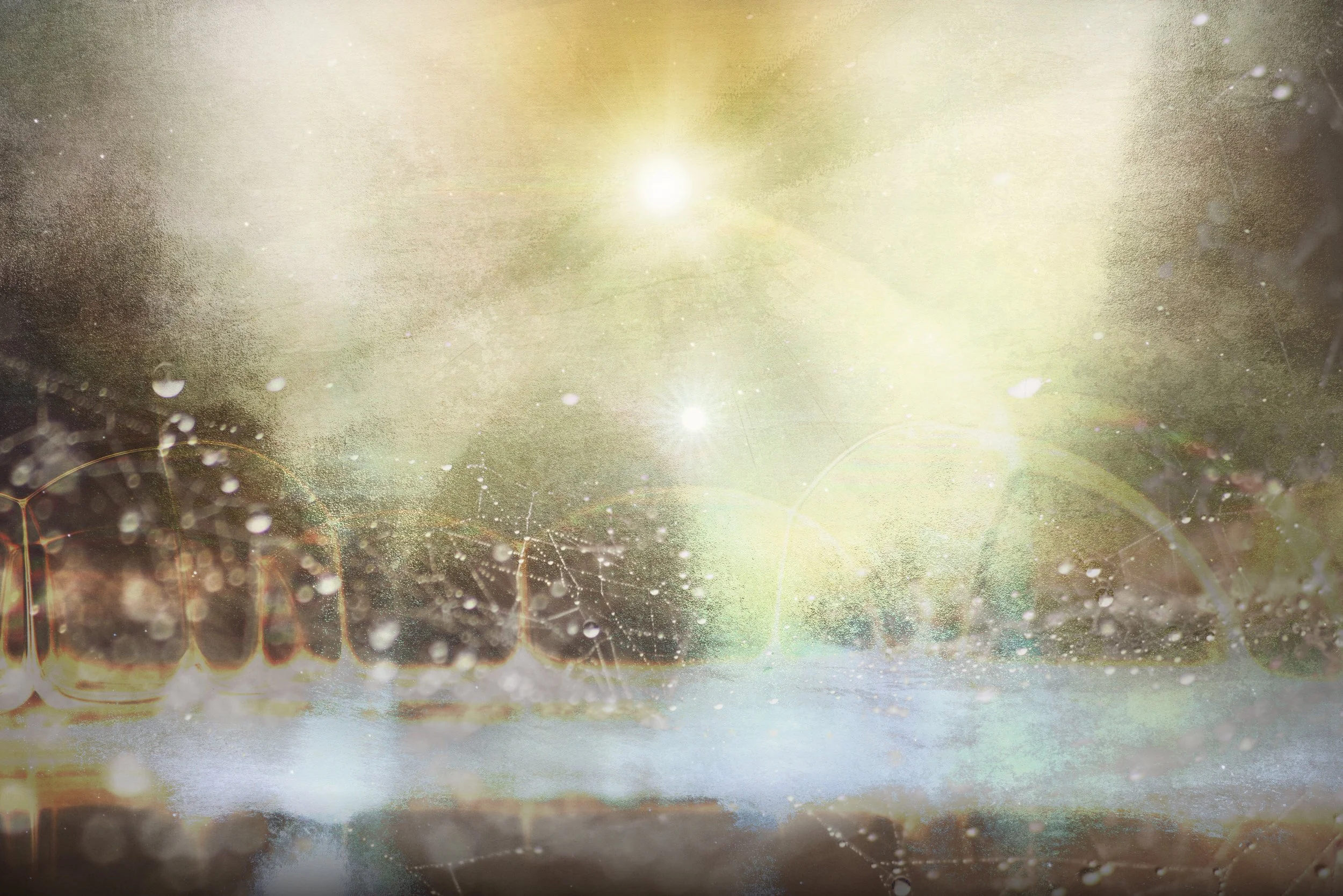 Shower of Light envisions the earth enveloped by descending radiance. In the lower zone, blue tones evoke the ocean and green hints at mountain form. A band of orange and yellow rises like dawn across the horizon. Above this threshold, a radiant field expands and pours downward, saturating the entire image. The layering dissolves boundary between matter and atmosphere, offering a moment where earthly elements and celestial light converge into a single field of perception. Viewers are invited to stand within the shower itself, to feel the sensation of being immersed in light rather than observing from a distance. The work suggests renewal and quiet transcendence, where familiar traces of land and water are lifted into luminous continuity. Through its balance of texture, atmosphere, and radiant flow, Shower of Light conveys a direct experience of transformation through illumination.