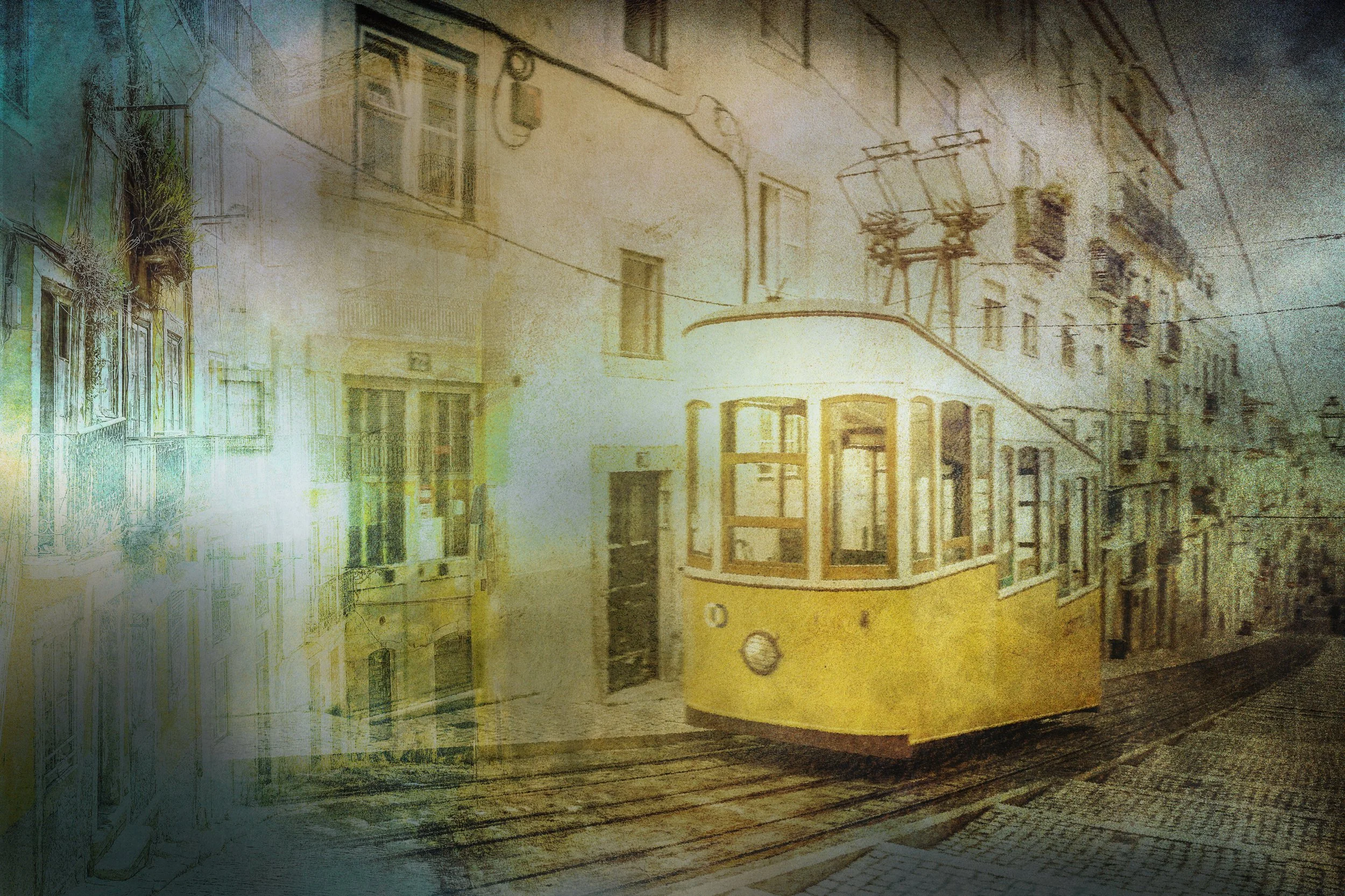 A yellow tram turns into a narrow, sloping street, its body pressed close to pale façades and hanging wires. Cobbled tracks curve downward into shadow. Lisbon appears as a moving pocket of light inside worn stone, a city remembered through the trace of this slow, mechanical ascent and descent.