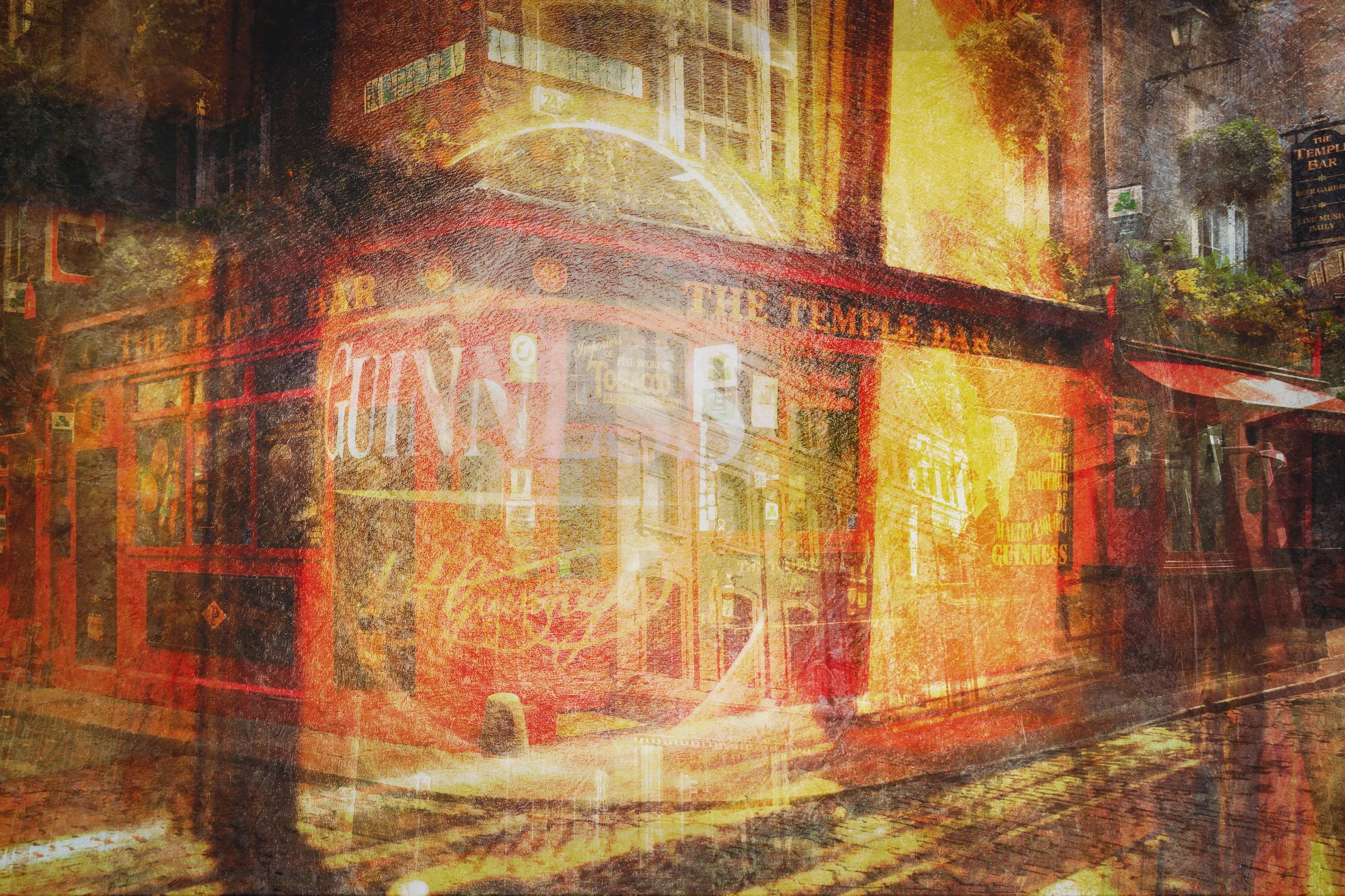 This work layers Dublin’s historic street textures into a single luminous field. Familiar signs—Guinness, The Temple Bar—surface through shifting veils of light, suggesting both presence and memory. The image is less a record of place than an atmosphere, where cultural identity dissolves into layered recollection and collective spirit.