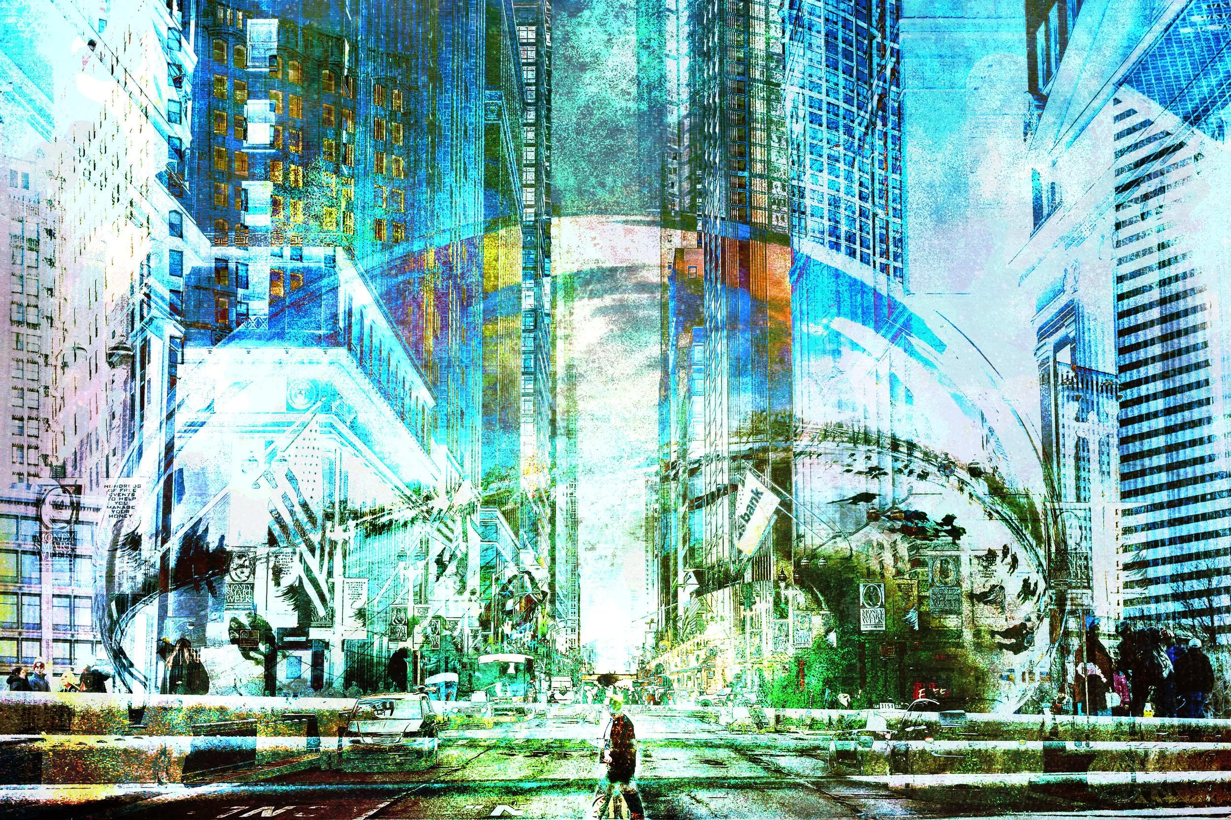 Chicago layers the city’s iconic skyline with the reflective surface of Cloud Gate, dissolving steel and glass into radiant fields of blue and green. Streets, buildings, and reflections converge, creating a city that feels simultaneously solid and fluid—a memory of presence shaped by atmosphere, light, and urban energy.