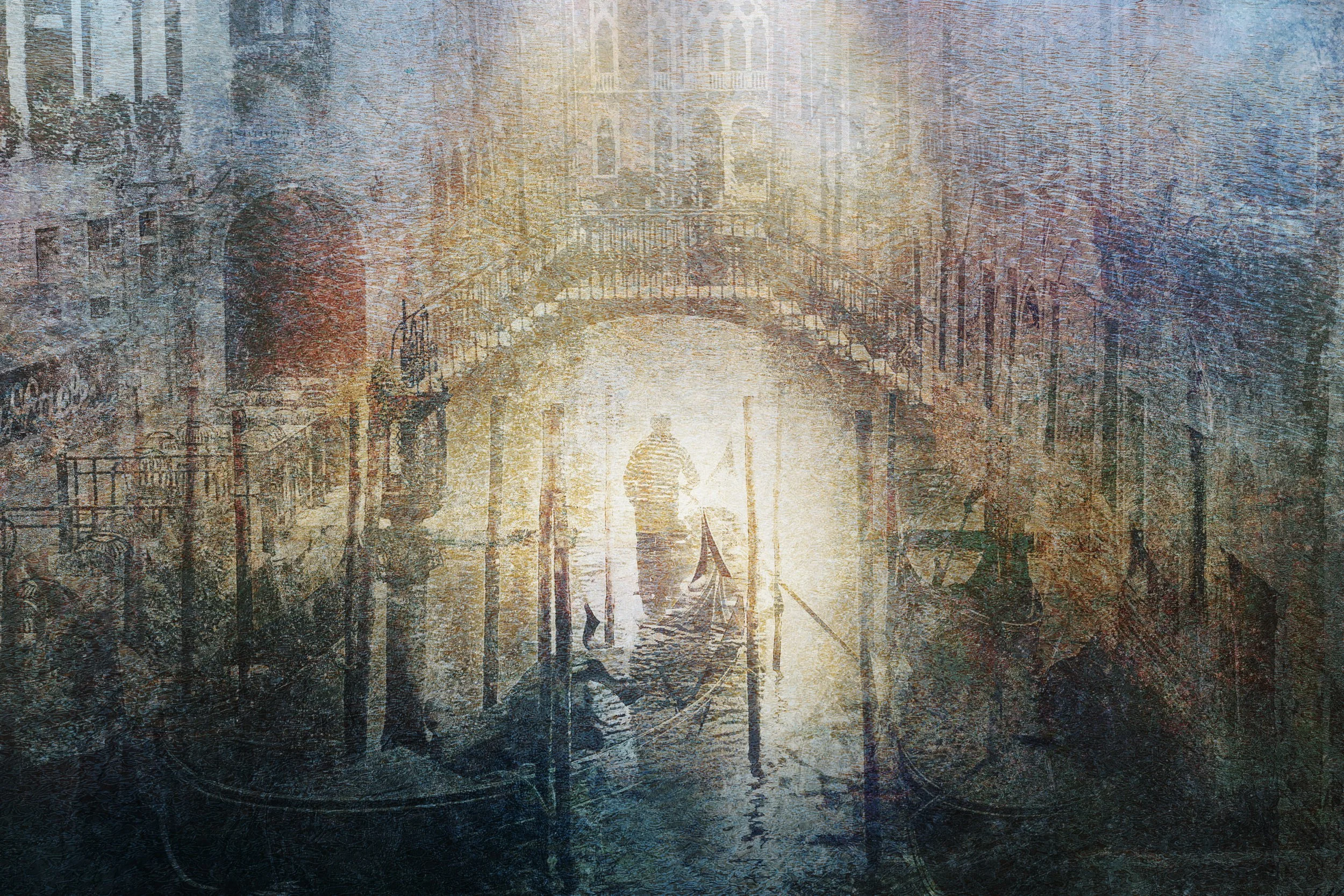 A gondolier moves through a corridor of light, framed by a bridge and facades that dissolve into color and grain. Piers and hulls rise as vertical marks, anchoring the scene. Venice appears less as a city of canals than as a luminous channel of passage and accumulated time.