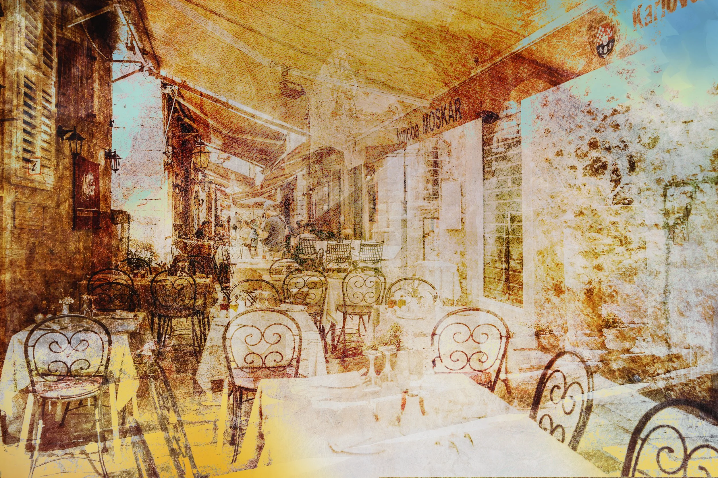 This image captures a Croatian restaurant street scene, dissolved into layers of warm light and textured memory. Empty chairs and tables wait in quiet stillness, while stone walls and awnings fade into atmosphere. The work evokes both presence and absence—hospitality remembered as a luminous impression rather than fixed detail.