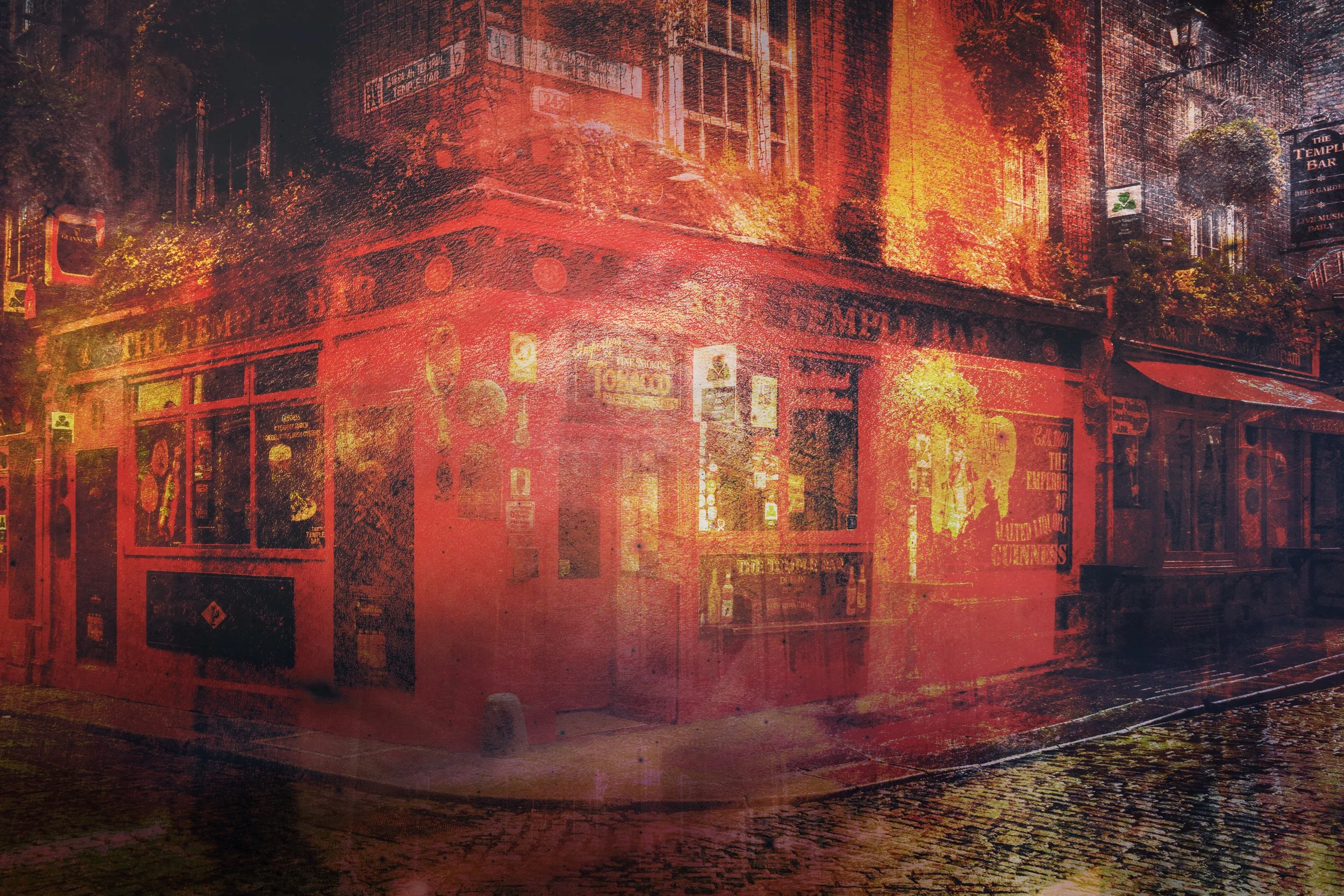 The Temple Bar glows as a block of saturated red and gold, pushing out into a dark street. Facades, signs, and windows blur into one continuous surface of light. The scene holds Dublin as a corner where building, night, and remembered music compress into a single, persistent afterimage.