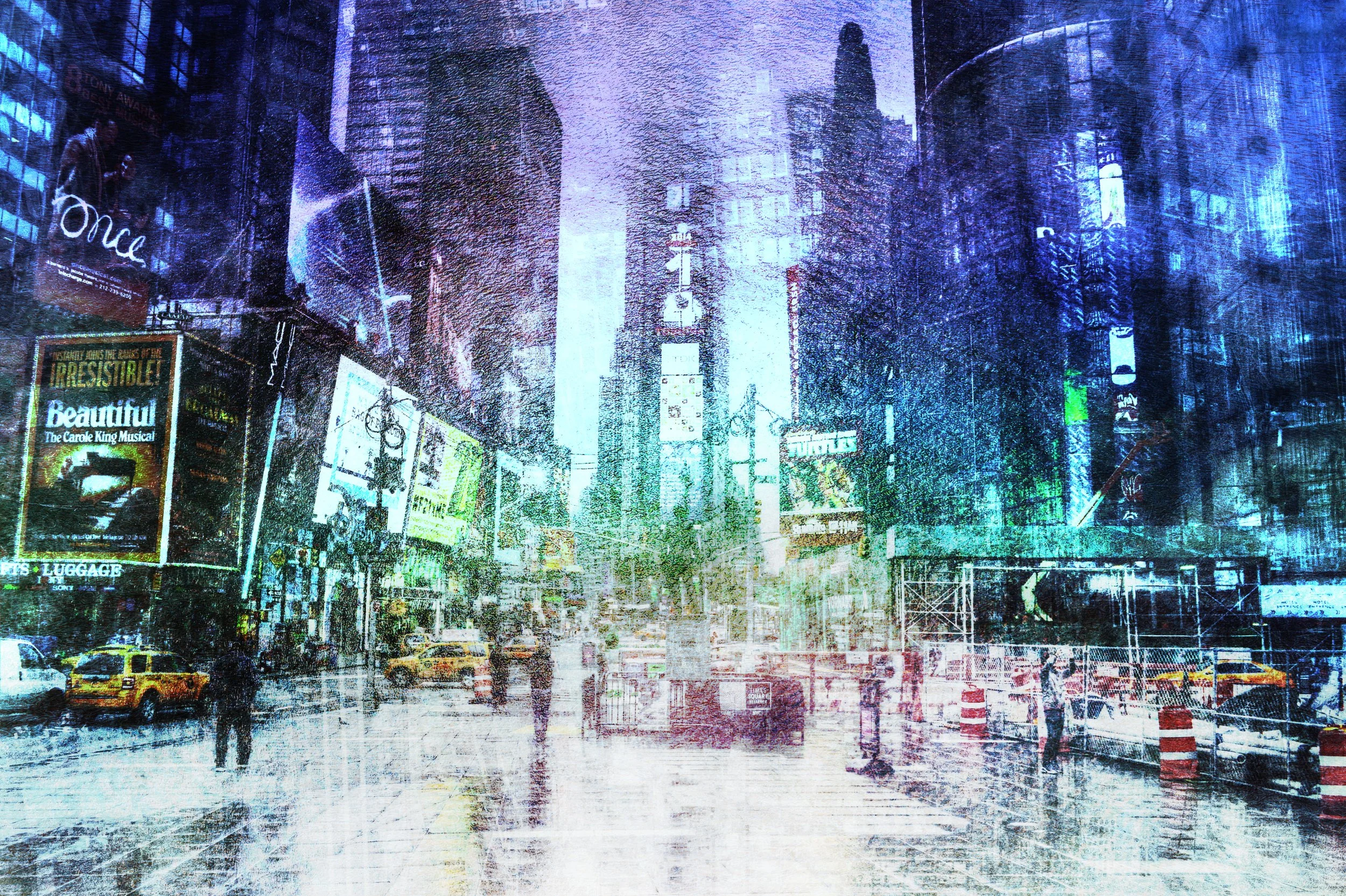 This work dissolves Times Square into layered textures of light, shadow, and advertisement. Neon signs, cabs, and scaffolding blur into a restless surface, suggesting both spectacle and disorientation. The image captures not the city’s clarity but its overwhelming pulse, where urban energy becomes an abstract vibration of color and motion.