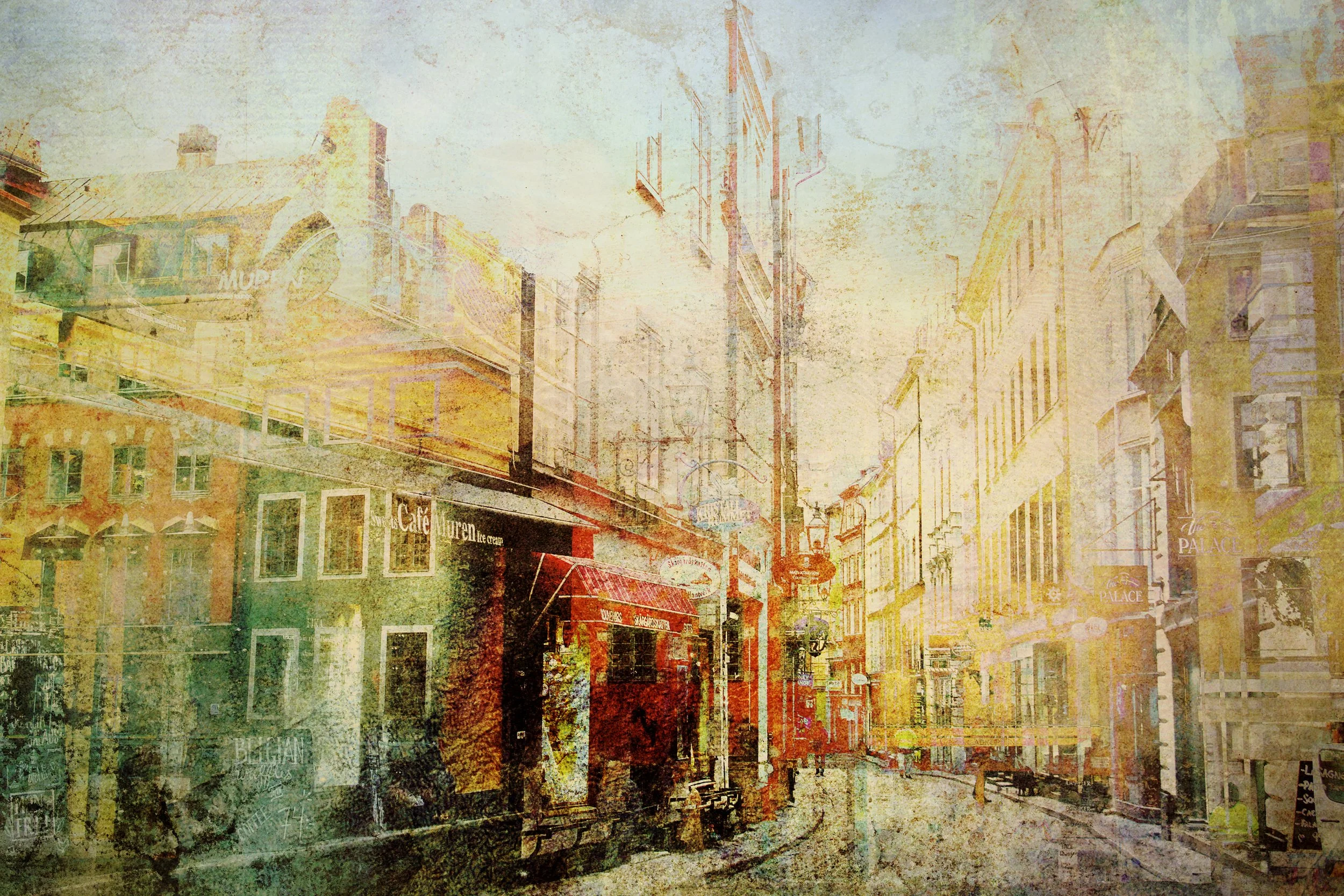 This work layers Stockholm’s historic streets into a luminous haze of yellow and ochre. Architectural lines dissolve into textured surfaces, evoking both memory and light. The familiar façades of cafés and passageways blur into atmosphere, suggesting the city as an impression carried in time rather than a fixed place.