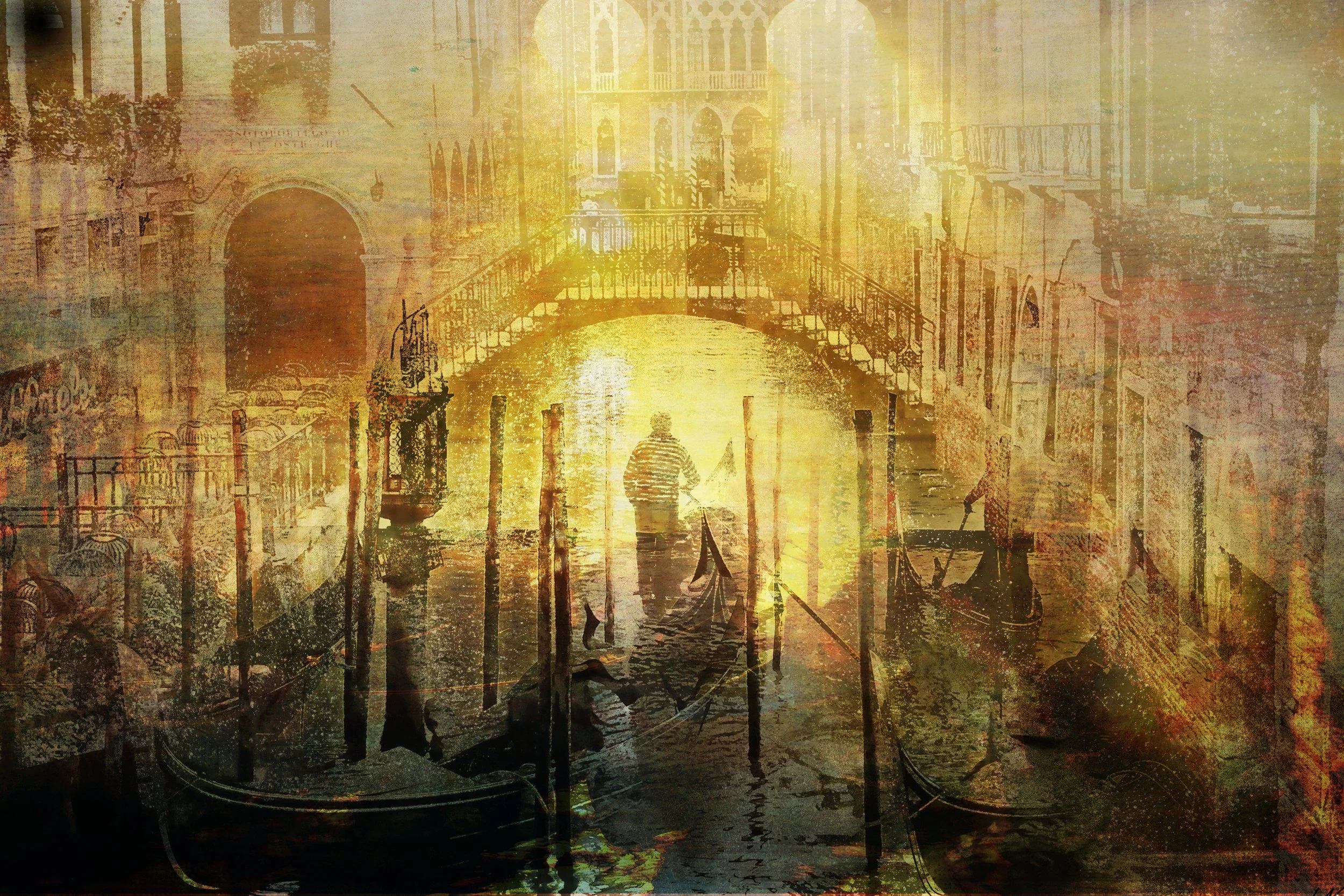In this vision of Venice, light overtakes form. A gondola moves through a narrow canal, and another crosses the Grand Canal—each drawn toward a field of radiance. The city becomes memory in motion, its beauty dissolving into warmth and reverence. What remains is presence suspended in light.